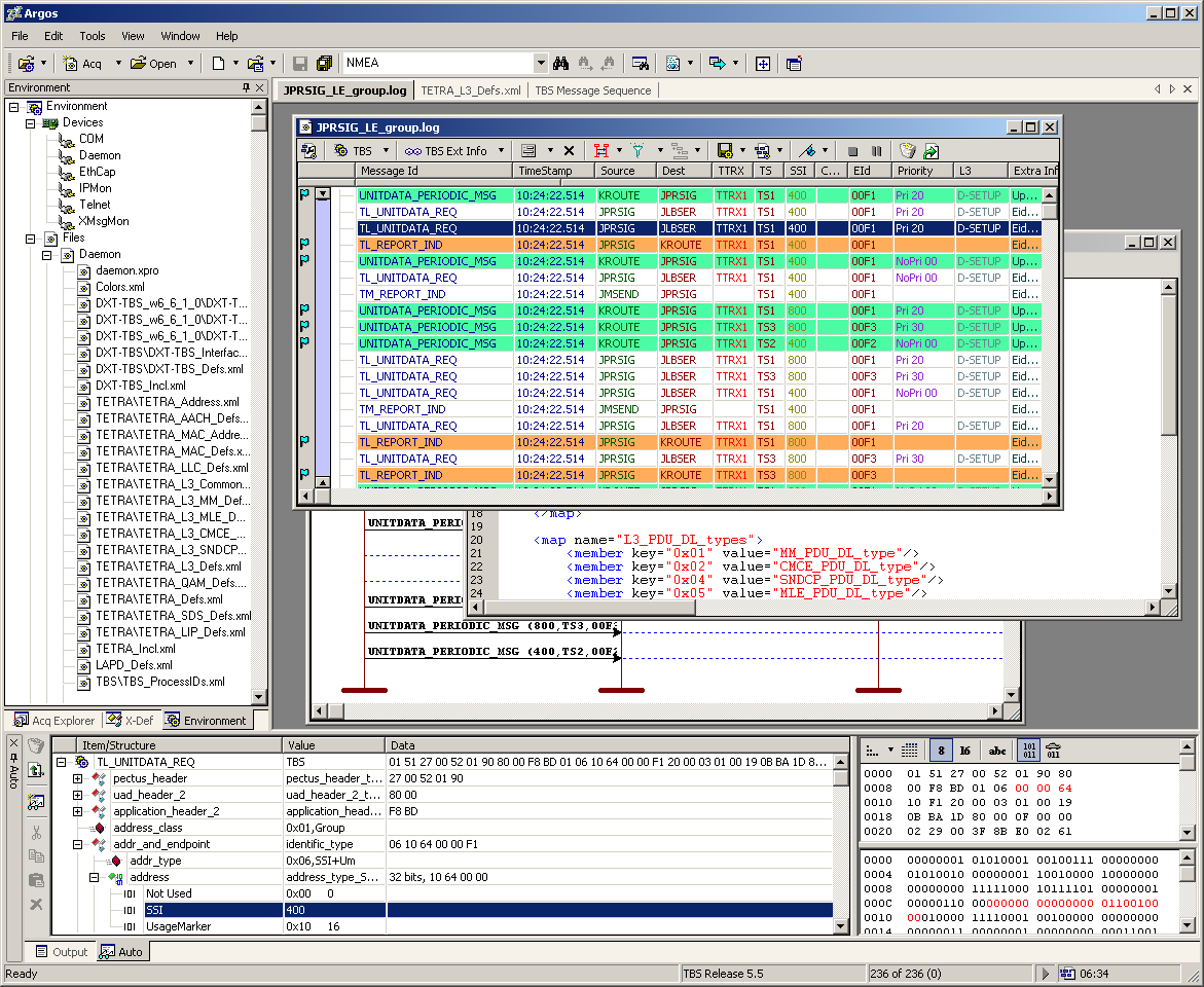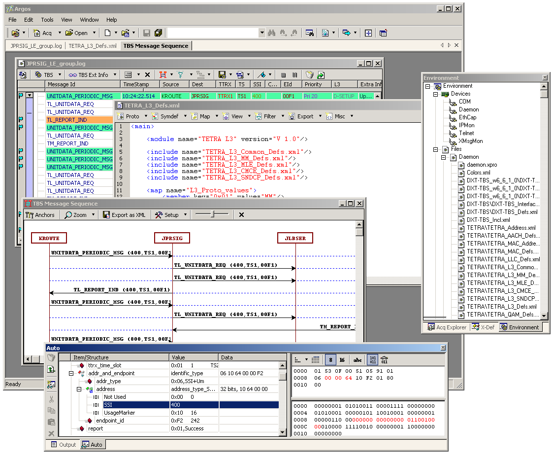 The Argos multi-document interface also hosts a hex, text and XML editor. The hex editor can be used to open and inspect and edit binary log files. The text editor can be used for any text mode editing, and especially text based log files.