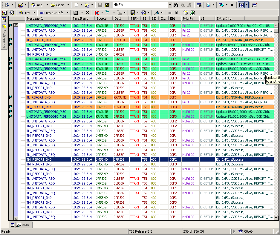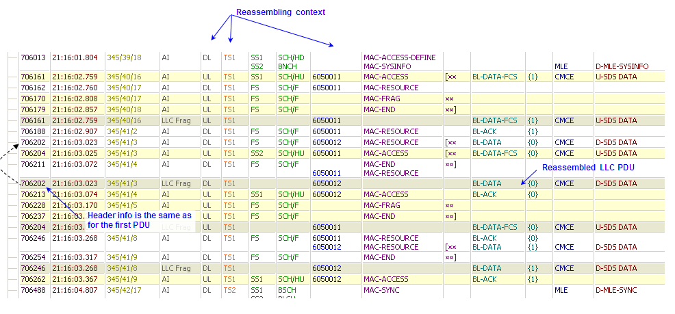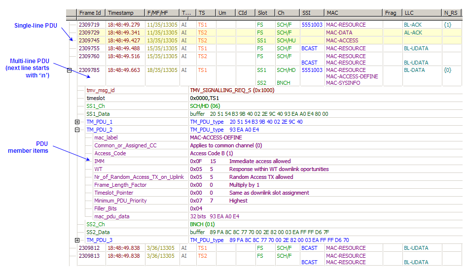 Each column cell can display one or more, formatted PDU member values. The last column is usually displays a formatted resume with the most important PDU members, which speeds up the protocol data overview and reduces the need for expanding the PDUs.