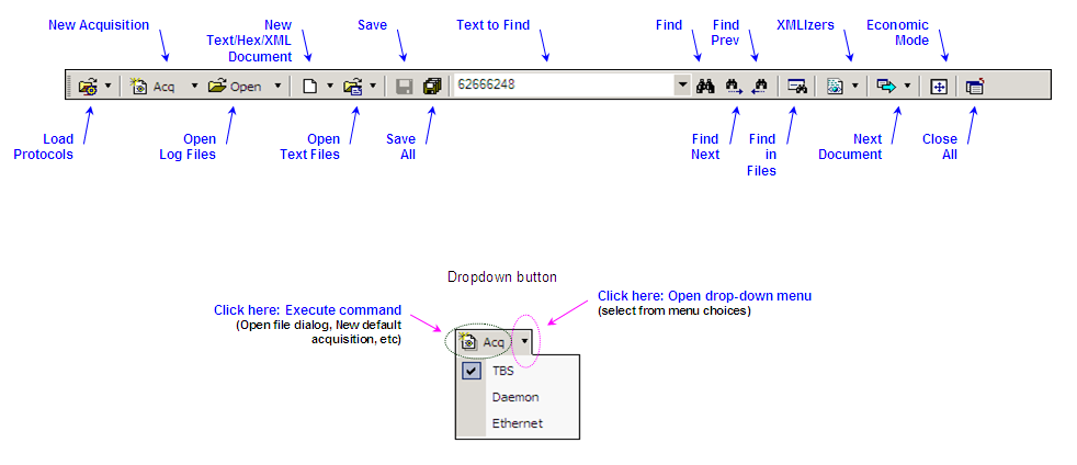 For smaller resolution laptop screens, the Economic mode maximizes even more the protocol data view area, with quick access to all menu commands. With the Economic mode button from the toolbar, both Explorer and Output windows are put to auto-hide mode, and the main menu is available as a drop-down menu in the main toolbar. The mainframe area is maximized for PDU view. Toggling the Economic mode button will restore the previous window configuration.