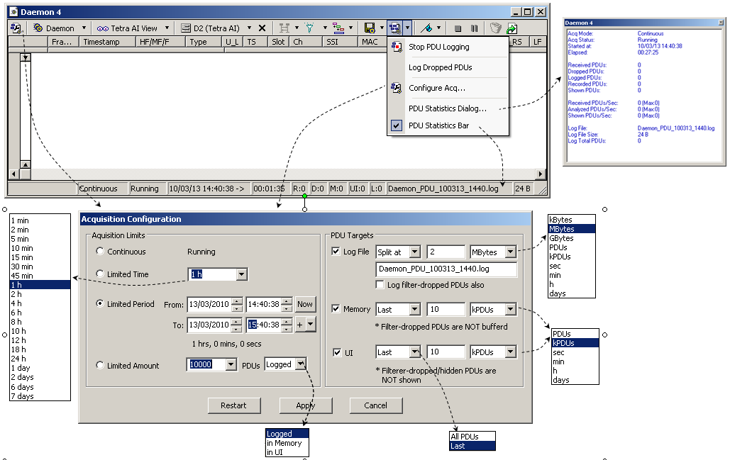 The protocol data acquisition an logging can be configured for continuous, time period or number of PDUs mode. The log files can be split by size, time or number of PDUs, and the storage to memory and user interface can be disabled or configured to use minimal resources. With these configurations, long time protocol data acquisition is possible.