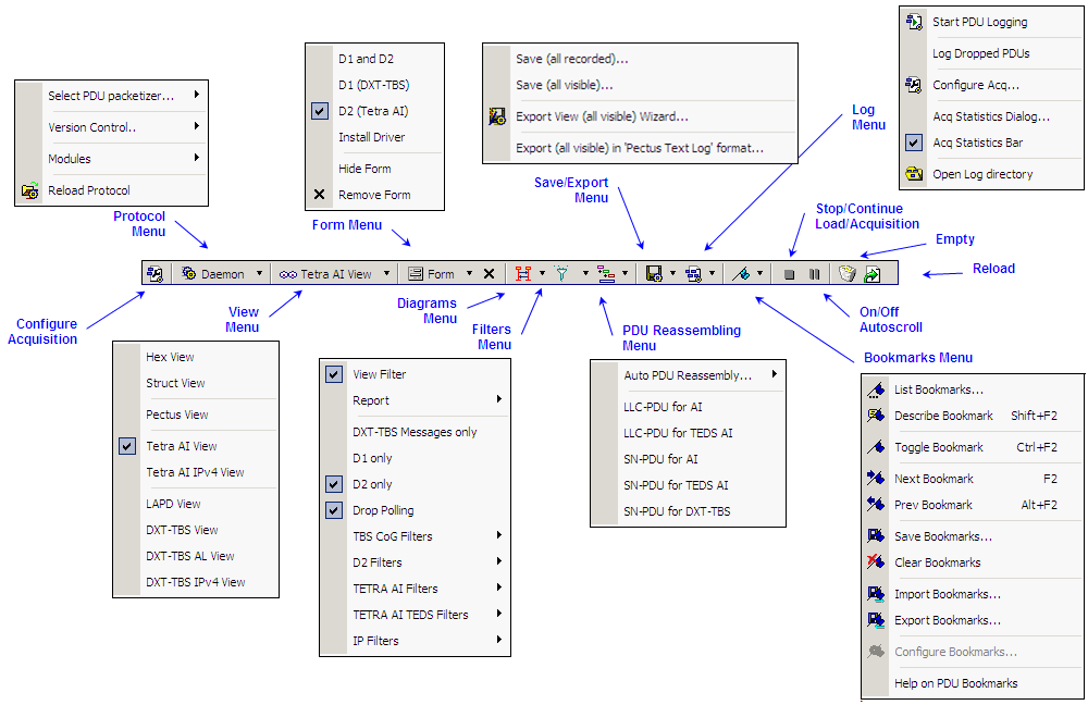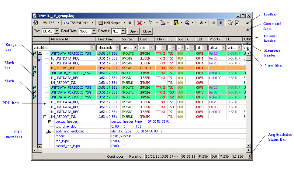 By opening a pop-up menu on a PDU, additional commands are available as jump to protocol definitions, PDU location in log file, copy cell and column content, with members, to clipboard in simple or formatted text, timestamp difference, set the limits of the range bar, and some of the commands available also in the toolbar.
