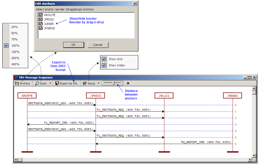 The message diagrams can be zoomed, the anchors reorganized, and rxported to Microsoft Visio 2003 or later, XML compatible format.