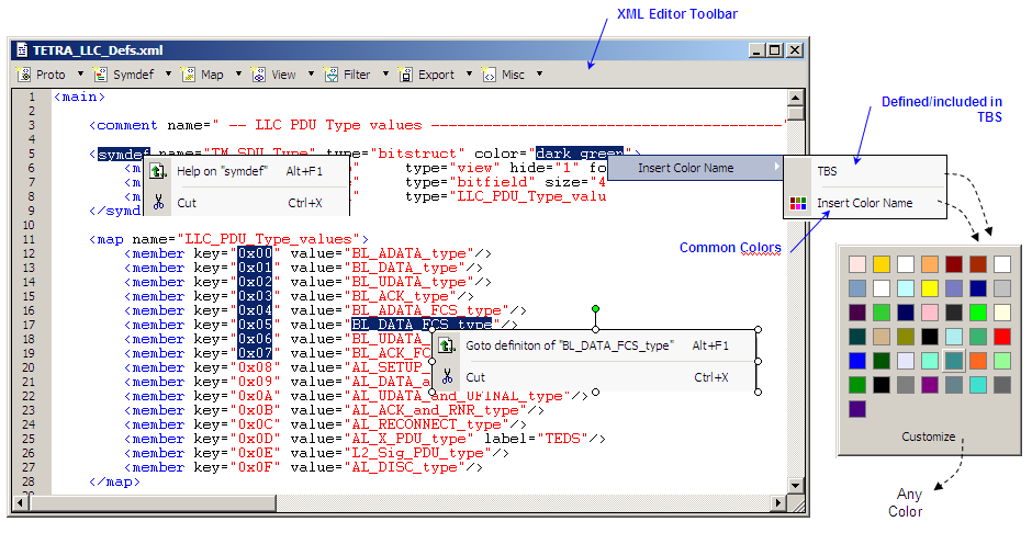 The XML editor is for viewing and editing the XML protocol definition files. It has its own toolbar for inserting XML protocol definition element templates, and various extra commands in the pop-up menu, which facilitates the navigation and development of the XML protocol definitions, like jump to definition, jump back-track, help on keyword, insert colors from color pickers, etc.